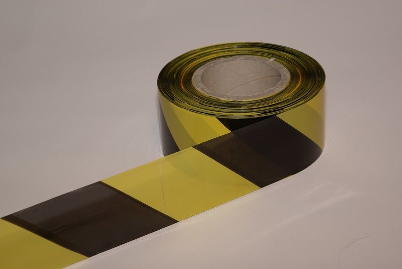 Varningsband, 500 m på rulle, svart/gul. Av hållfast polyetenplast, på rulle om 500 meter. Bredd 70 mm. Finns i svart/gul eller röd/vit färg.