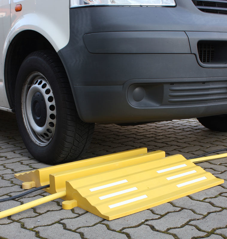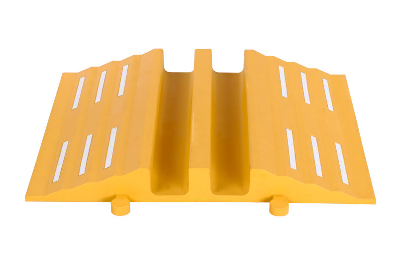 Kabelbrygga Trinnan, LxBxH 830x680x85 mm, gul. Kabelbrygga som skyddar både slangar och kablar i trafikerade områden. Tillverkad i gummi, genomfärgat nytt material, vilket gör kabelkanalen extremt tålig och långlivad. Passar lika bra inomhus som utomhus, både vinter och sommar. Enkel att koppla ihop, kan byggas med varningsmönster svart/gul för bästa uppmärksamhet. Reflekterande folie på båda sidor. Utrustad med två kanaler, max ø75 mm på slang eller kabel. Överkörningsbar med lastbil. Max belastning max 40 ton.