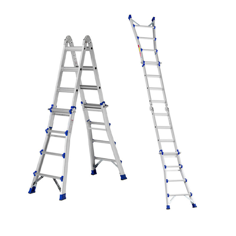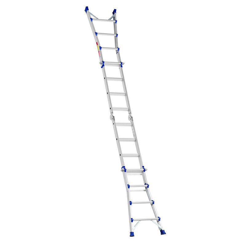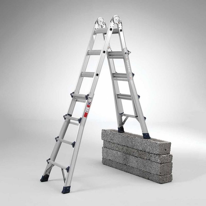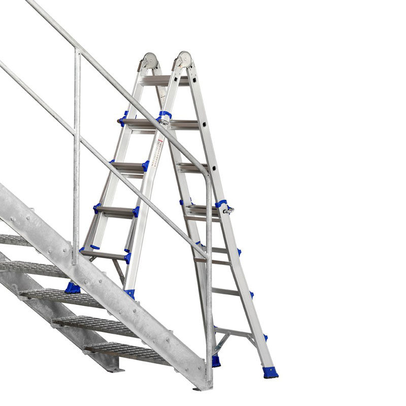 Stege Skeppshultstegen Universalstege, kombinationsstege, maxlängd 4,2 m. Stege med många användningsområden. Kan användas som enkelstege, fristående stege, på ojämna underlag samt i trappor. Justeras i 280 mm intervaller med hjälp av kraftiga fjäderbeslag. Kompakta yttermått i transportläge. Försedd med förstärkningsstag och kraftiga golvskydd. TIllverkad i anodiserad aluminium.
