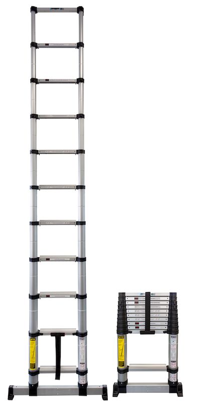 En kraftig teleskopstege tillverkad i anodiserad aluminium. Teleskopstegen justeras enkelt till rätt längd med hjälp av en kraftig låsmekanism som låser stegen steg för steg. Låsmekanismen indikerar även när steget låst fast ordentligt med hjälp av en grön markering. Teleskopstegen står stadigt på kraftiga golvskydd.