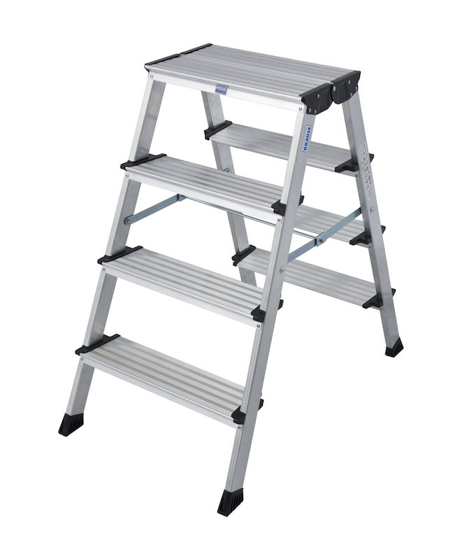 Dubbelsidig Trappstege Ellen, aluminiumsteg med räfflad yta, 4 steg per sida. Stabilitet möter användarvänlighet: TREPPO dubbelsidig fällstege imponerar med en extra stor halksäker ståyta och djupa steg som ger ökad säkerhet vid användning.