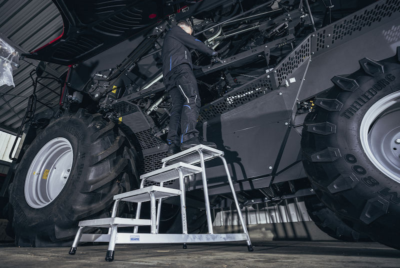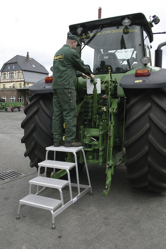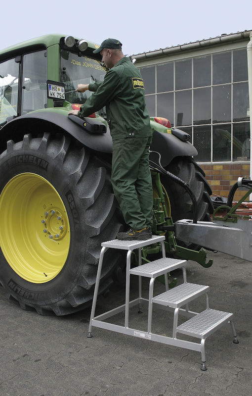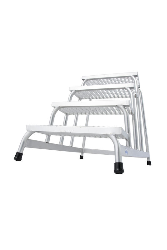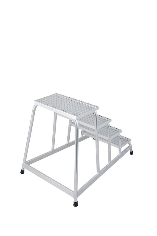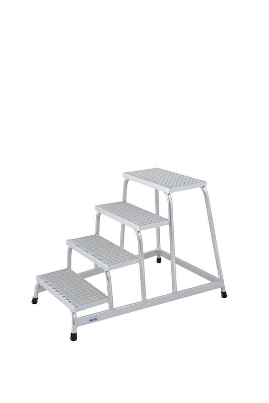 Den stabila plattformsstegen är konstruerad av helsvetsade aluminiumrör och utrustad med särskilt utformade framkanter på stegen för extra grepp vid upp- och nedstigning. Halkskyddade fotkapslar ökar stabiliteten även på släta golv. Perfekt för användning i exempelvis verkstadshallar, produktionsmiljöer eller på byggarbetsplatser.