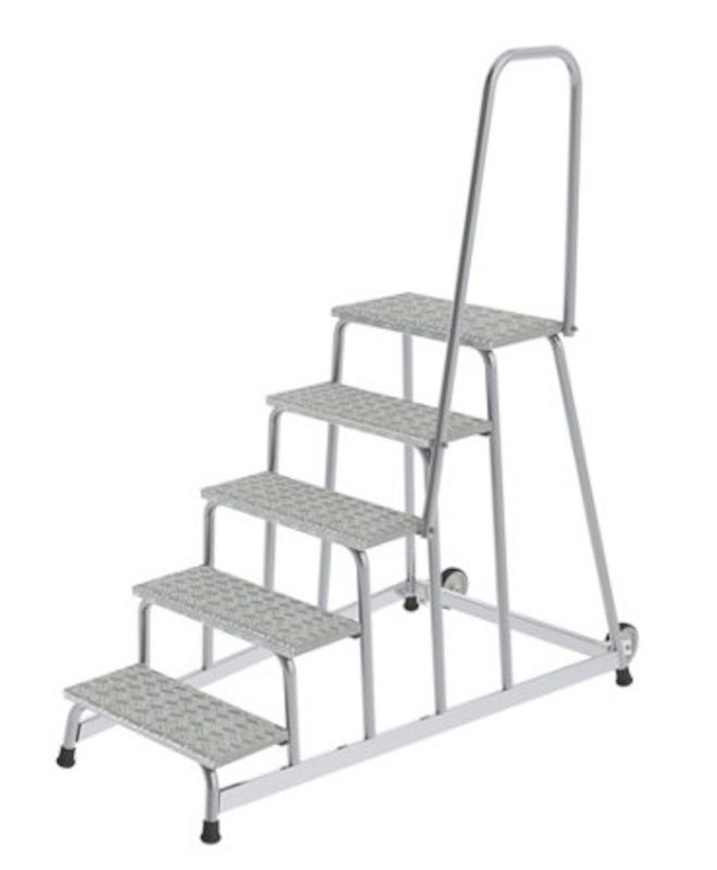 Mobil Arbetstrappa, 2 fasta hjul, ledstång på ena sidan, 5 steg, BxD 840x1390 mm. Med räfflade aluminiumsteg för ökad säkerhet. Särskilt stabil och stadig av svetsad rörkonstruktion i aluminium. Steg av halksäker, räfflad plåt, 225 mm djupa. Övre stegyta 550x300 mm. Halksäkra fötter av plast. Hög säkerhet tack vare 900 mm hög ledstång på ena sidan. Körbar med 2 fasta hjul. Finns i olika storlekar.