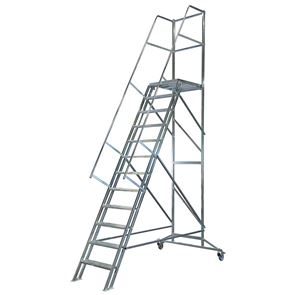 Stommen är tillverkad av blankförzinkade stålrör. Kraftiga hjul med gummibana gör trappan lätt att flytta.