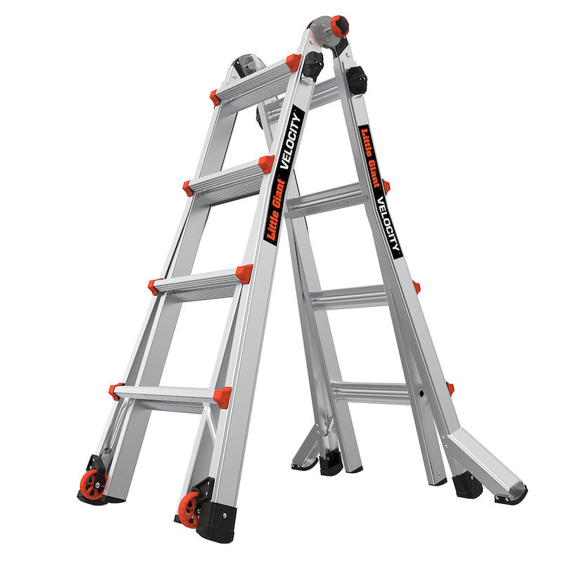 Stegen är utrustad med hjul vilket gör den enkel att flytta och transportera.