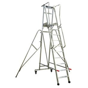 På högre höjder står du stabilt med extra djupa halksäkra trappsteg och plattform med halksäker yta, fotlister och rejält räcke på tre sidor. Praktisk avlastningsyta framtill på räcket.