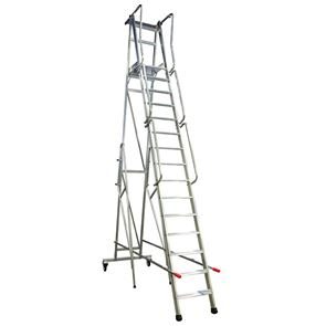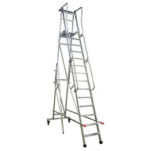 Plattformsstege med hjul 3000 mm, 12-steg. Mobil plattformstege utrustad med hjul, skyddsräcke och rejäl plattform. Lätt och stabil aluminiumtrappa som är hopfällbar vid behov. Godkänd enligt den europeiska och svenska standarden EN131-7 för mobila trappstegar med plattform.