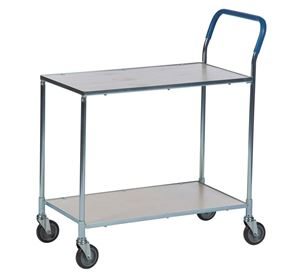 Bordsytan på 760x430 mm har laminatskivor som gör det lätt att hålla rent. Vagnen har smidiga hjul, med länkhjul som gör att du enkelt kan styra den, även i trånga utrymmen. Rörramen är förzinkad och har ett plastklätt bygelhandtag.