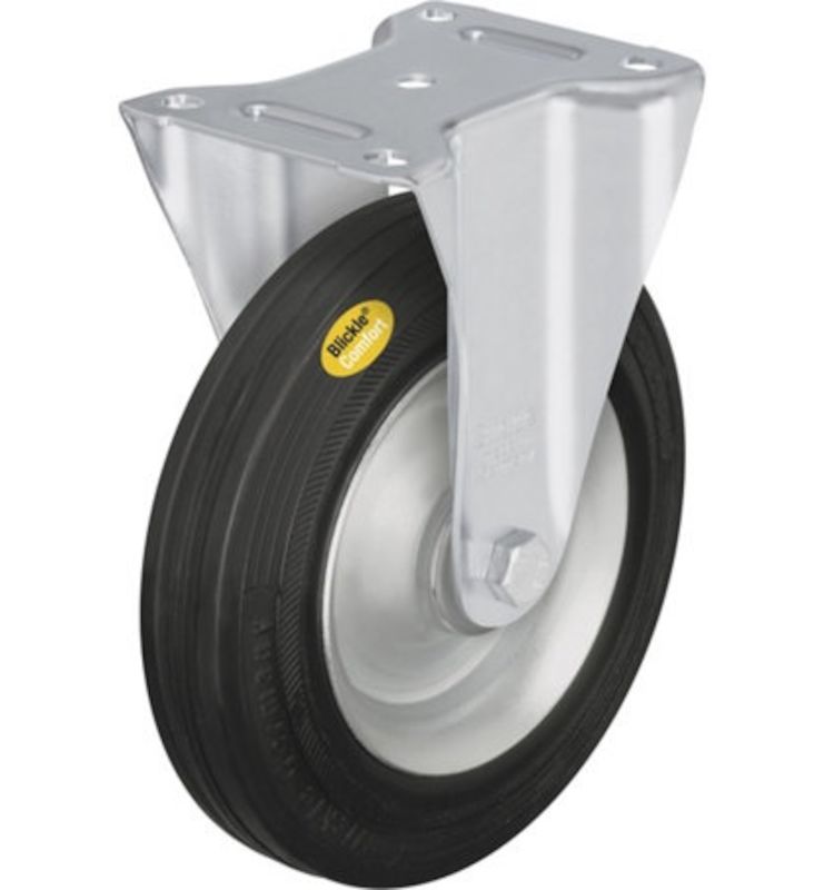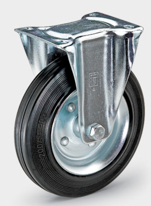 Halvelastiskt hjul, stålfälg, ØxB 180x50 mm, fast hjul, max 300 kg. På stålfälg med högt slitagemotstånd. Förbättrat igångkörningsmotstånd. Temperaturbeständigt från -5 °C till +80 °C. Hus av stålplåt, galvaniserat-kromat, styrspindel med dubbel kulkrans, styrspindelskydd, fälgar av stålplåt, blankgalvaniserade. Rullager.