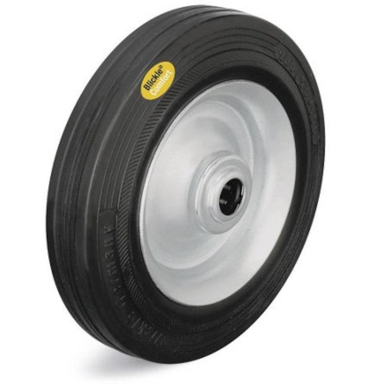 Halvelastiskt hjul, stålfälg, löst hjul, rullager, ØxB 200x50 mm, max 300 kg. På stålfälg med högt slitagemotstånd. Förbättrat igångkörningsmotstånd. Temperaturbeständigt från -5 °C till +80 °C. Hus av stålplåt, galvaniserat-kromat, styrspindel med dubbel kulkrans, styrspindelskydd, fälgar av stålplåt, blankgalvaniserade. Rullager.