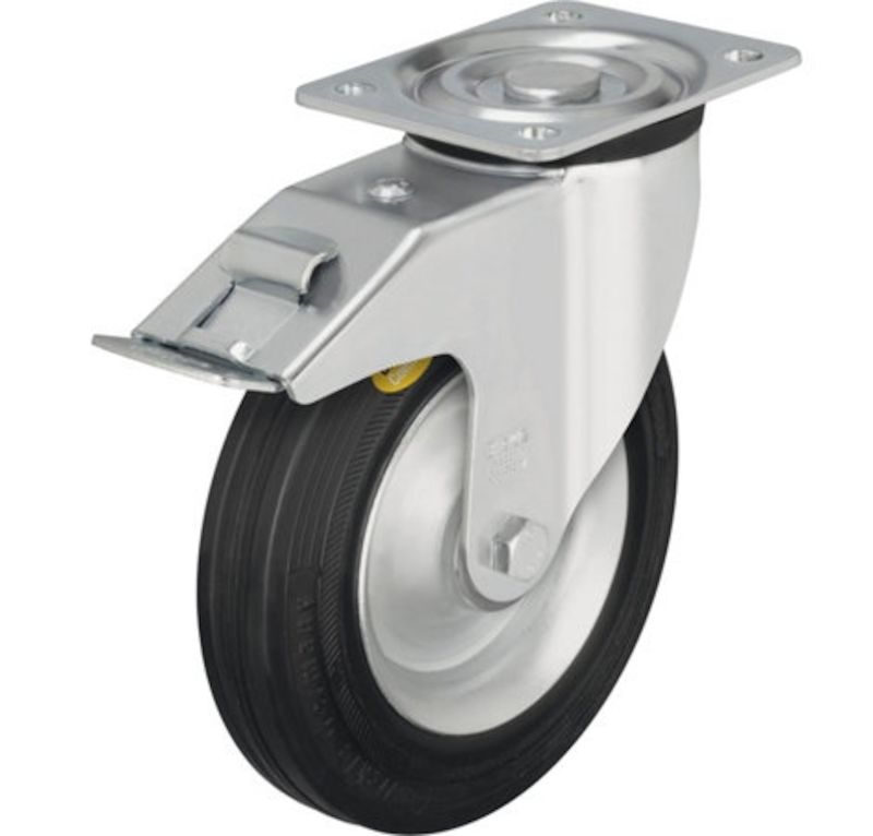 Halvelastiskt hjul, stålfälg, ØxB 200x50 mm, länkhjul med broms, max 300 kg. På stålfälg med högt slitagemotstånd. Förbättrat igångkörningsmotstånd. Temperaturbeständigt från -5 °C till +80 °C. Hus av stålplåt, galvaniserat-kromat, styrspindel med dubbel kulkrans, styrspindelskydd, fälgar av stålplåt, blankgalvaniserade. Rullager.