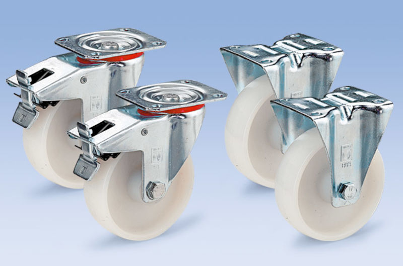 Industrihjul av polyamid, 2 länkhjul med broms, 2 fasta hjul, glidlager, ØxB 125x38 mm, max 200 kg. Underhållsfritt hjul med lätt gång. Nötningståligt, håller länge. Till stor del beständigt mot många utspädda syror och alkalier. Temperaturbeständigt från –20 °C till +80 °C. Hus av stålplåt, galvaniserat-kromat, styrspindel med dubbel kulkrans, styrspindelskydd. Speciellt fördelaktig i sats! Glidlagrat.
