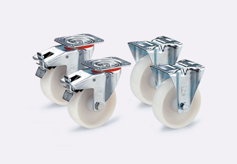 Industrihjul av polyamid, 2 länkhjul med broms, 2 fasta hjul, glidlager, ØxB 80x35 mm, max 150 kg. Underhållsfritt hjul med lätt gång. Nötningståligt, håller länge. Till stor del beständigt mot många utspädda syror och alkalier. Temperaturbeständigt från –20 °C till +80 °C. Hus av stålplåt, galvaniserat-kromat, styrspindel med dubbel kulkrans, styrspindelskydd. Speciellt fördelaktig i sats! Glidlagrat.