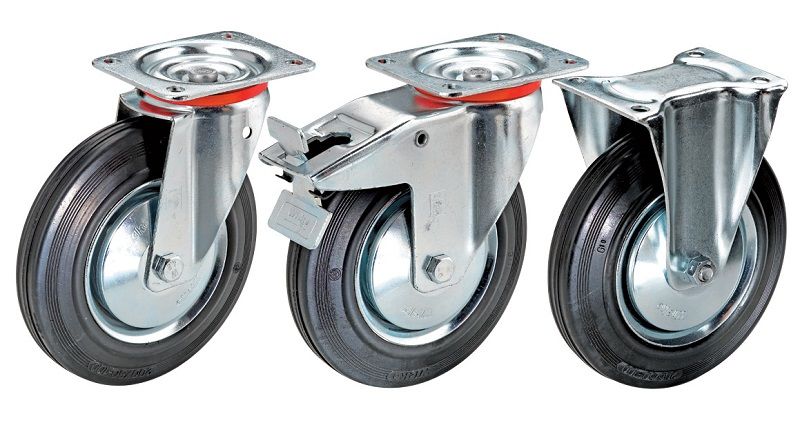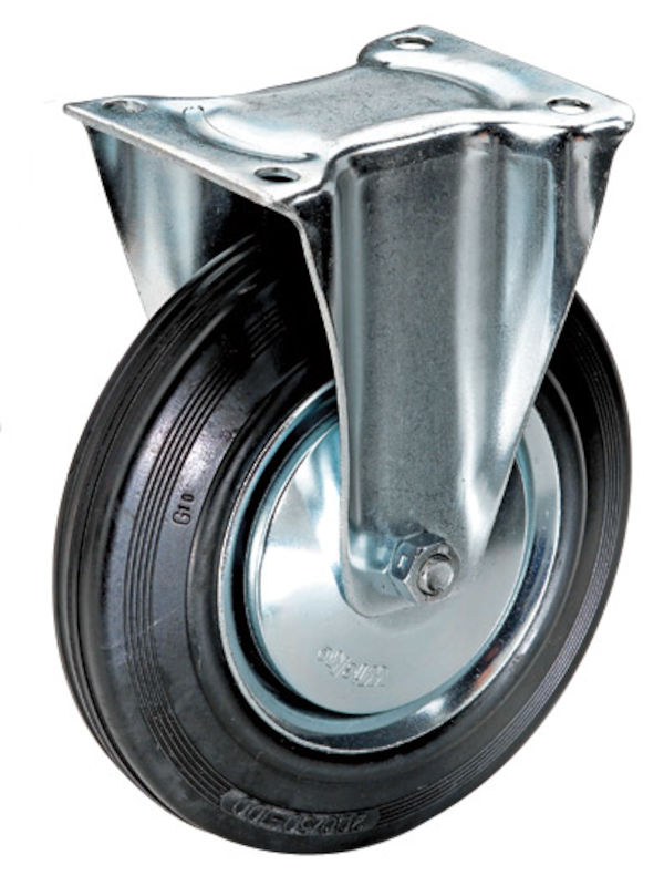 Massivgummihjul, stålfälg, ØxB 160x40 mm, fast hjul, max 135 kg. På stålfälg, för låg till måttlig belastning. Temperaturbeständigt från –5 °C till +60 °C. Hus av stålplåt, galvaniserat-kromat. Styrspindel med dubbel kulkrans, styrspindelskydd. Fälgar av stålplåt, blankgalvaniserade. Rullager.