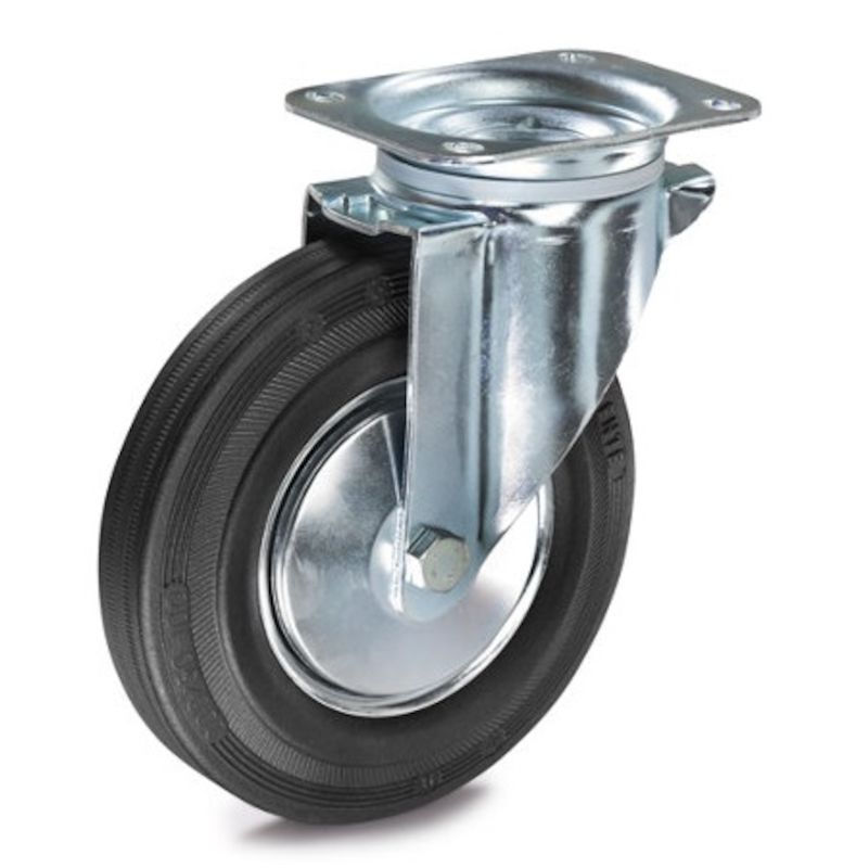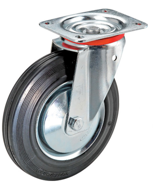 Massivgummihjul, stålfälg, ØxB 200x50 mm, länkhjul, max 205 kg. På stålfälg, för låg till måttlig belastning. Temperaturbeständigt från –5 °C till +60 °C. Hus av stålplåt, galvaniserat-kromat. Styrspindel med dubbel kulkrans, styrspindelskydd. Fälgar av stålplåt, blankgalvaniserade. Rullager.