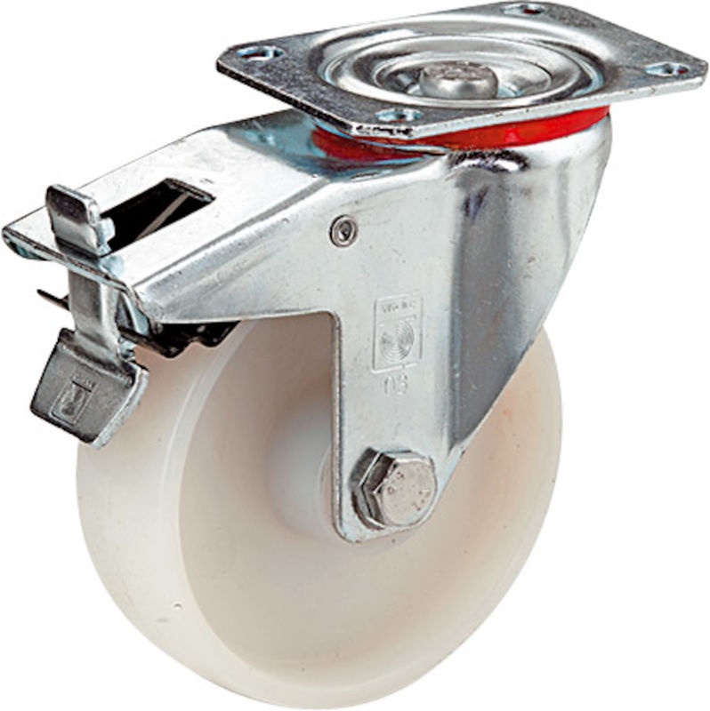 Polyamidhjul, hus av stålplåt, ØxB 100x38 mm, broms, rullager, max 180 kg. Länkhjul med glidlager eller rullager. Underhållsfritt hjul med lätt gång. Nötningstålig, håller länge. Till stor del beständigt mot många utspädda syror och alkalier. Temperaturbeständigt från –20 °C till +80 °C. Hus av stålplåt, galvaniserat-kromat. Styrspindel med dubbel kulkrans, styrspindelskydd.