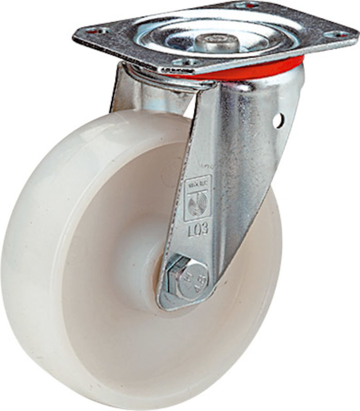Polyamidhjul, hus av stålplåt, ØxB 150x40 mm, glidlager, max 300 kg. Länkhjul med glidlager eller rullager. Underhållsfritt hjul med lätt gång. Nötningstålig, håller länge. Till stor del beständigt mot många utspädda syror och alkalier. Temperaturbeständigt från –20 °C till +80 °C. Hus av stålplåt, galvaniserat-kromat. Styrspindel med dubbel kulkrans, styrspindelskydd.