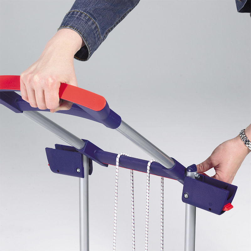 Med ett enkelt handgrepp är pirra RuXXac® klar för användning på några sekunder och enkel att fälla ihop igen efter användning. Extremt platssparande vid förvaring genom den smarta konstruktionen med en fällbar och låsbar rygg.