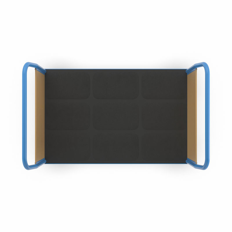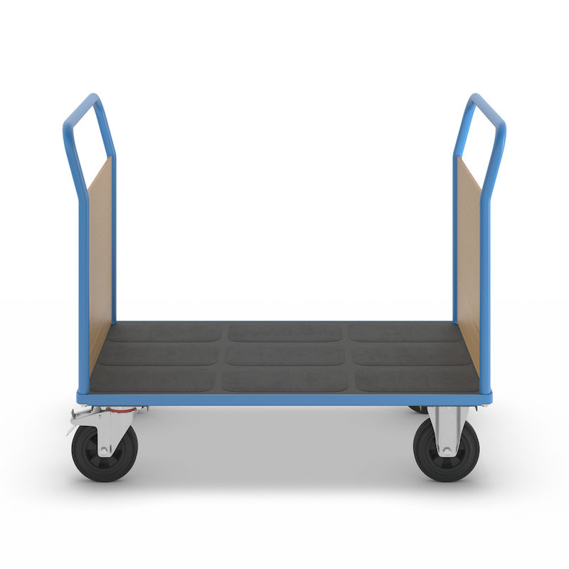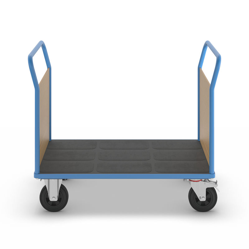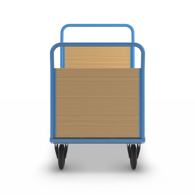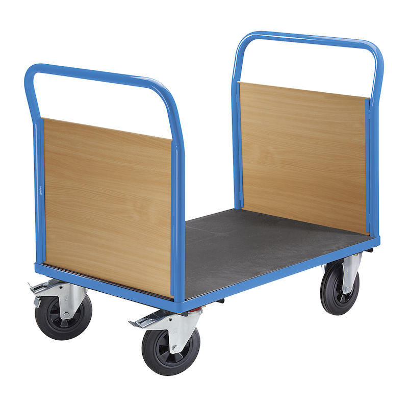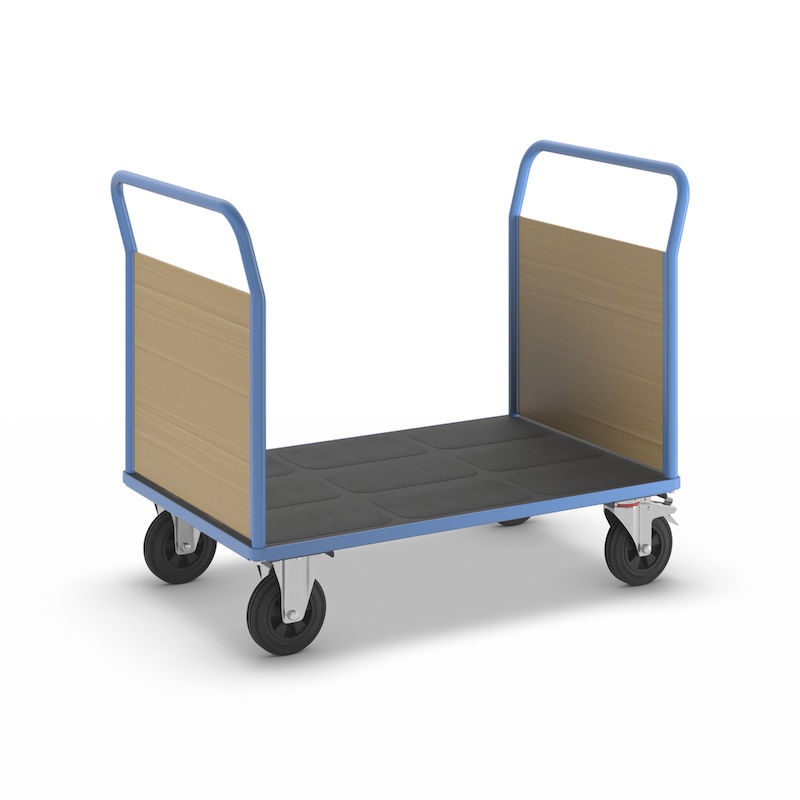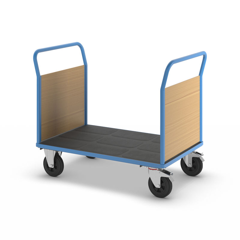 Plattformsvagn Line, med 2 gavlar, LxB 1250 x 800 mm, ljusblå. Plattformsvagnen med träsidor erbjuder en praktisk och mångsidig lösning för transport i olika tillämpningar. Den svetsade stålkonstruktionen med pulverlackering ger hög stabilitet och lång livslängd. Separat uttagbara sidor av MDF-skivor möjliggör flexibel användning och kan dekoreras individuellt. Med en lasthöjd på 280 mm och en robust lastyta av återvunnen plast kan vagnen enkelt transportera tunga laster. Den väderbeständiga, halksäkra och slitstarka ytan är olje- och i hög grad syrabeständig. Vagnen är ett säkert, effektivt och hållbart hjälpmedel för varutransporter i lager, verkstad eller industri.