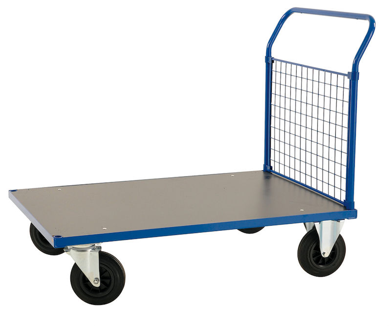 Plattformsvagn Uvan, nät, LxBxH 1083x700x1020 mm, blå, 1 gavel. Plattformsvagn med en lastkapacitet på 500 kg. Kraftig pulverlackerad stålkonstruktion med lastplan, gavlar och sidor i laminat eller nät. 2 fasta och 2 svängbara hjul, diameter 200 mm. Finns i flera olika storlekar.