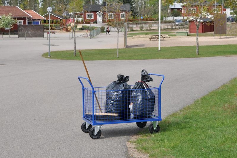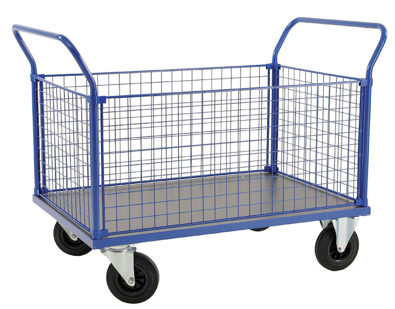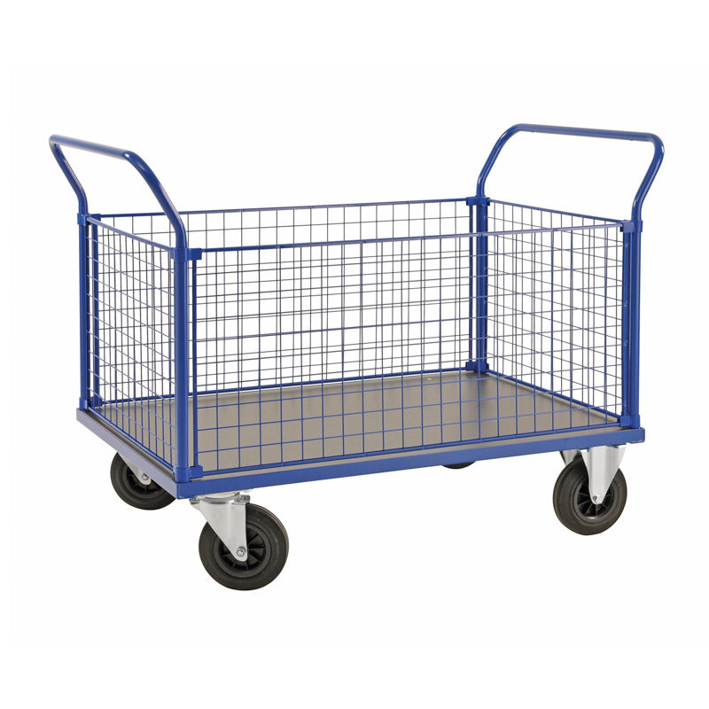Plattformsvagn Uvan, nät, LxBxH 1366x800x1020 mm, blå, 4 gavlar. Plattformsvagn med en lastkapacitet på 500 kg. Kraftig pulverlackerad stålkonstruktion med lastplan, gavlar och sidor i laminat eller nät. 2 fasta och 2 svängbara hjul, diameter 200 mm. Finns i flera olika storlekar.