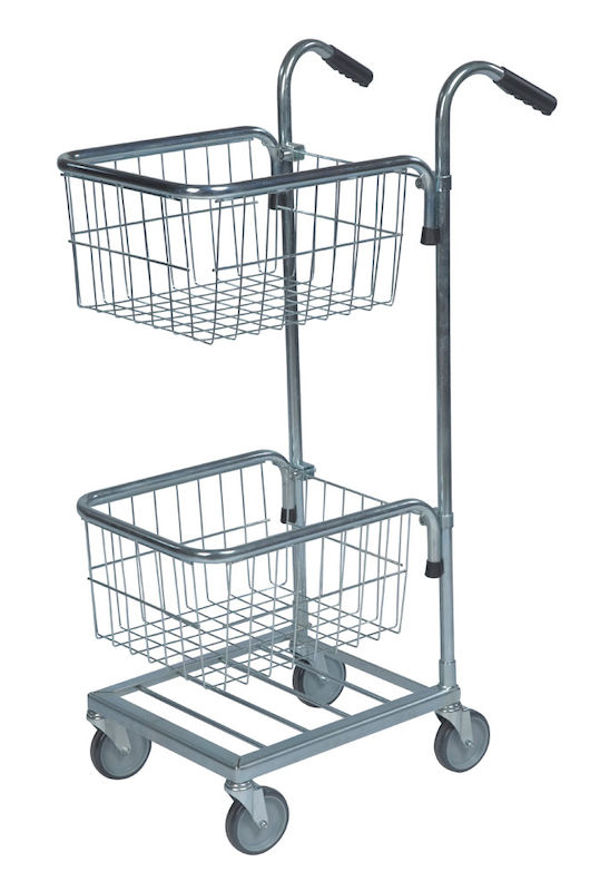 Minivagn Idö, med två korgar, HxBxD 1090x355x660 mm. Elförzinkad minivagn med fyra länkhjul. Steglöst ställbara trådkorgar.