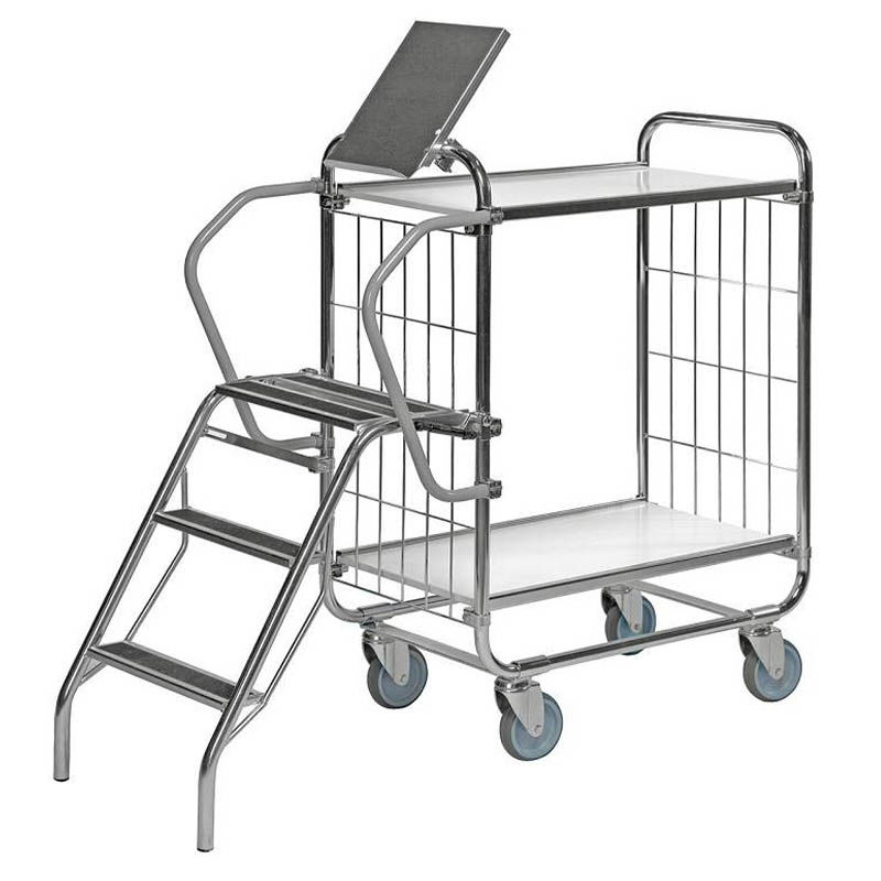 Plockvagn Ven, med stege, 2 hyllplan, LxBxH 815x470x1120 mm, som har en automatiskt återgående stege. Plockvagnen är elförzinkad med laminatskivor.