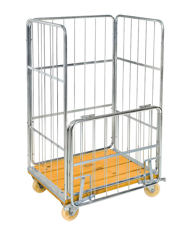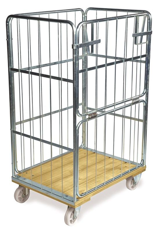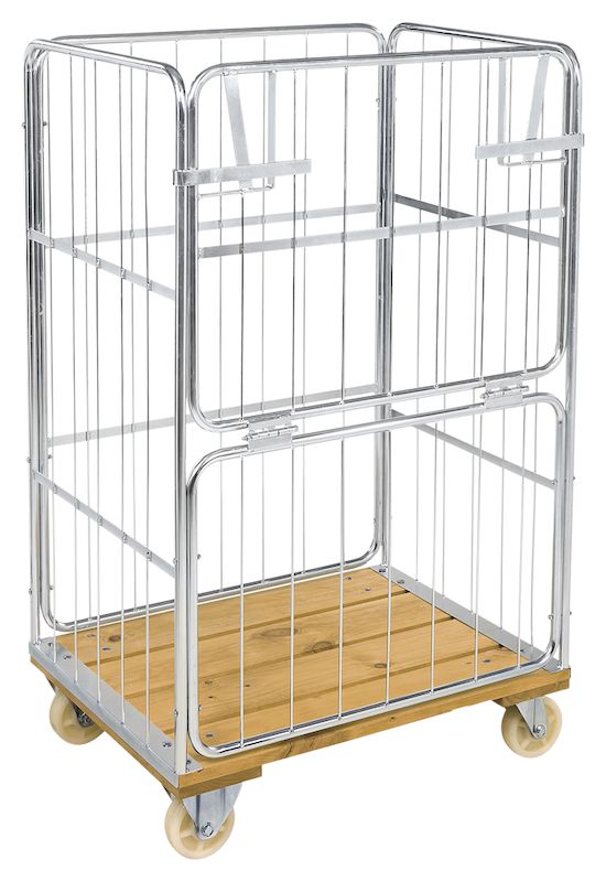 Rullcontainer med trägolv, 1 halv grind, LxBxH 845x630x1390 mm, max 500 kg. Elförzinkad rullcontainer med 1 halvhängd grind på långsidan.