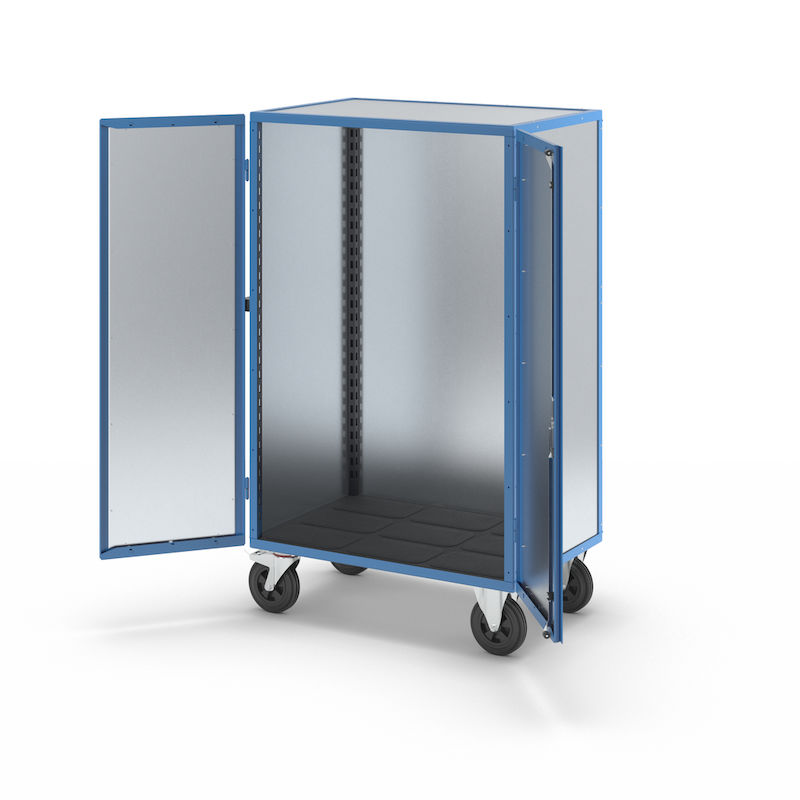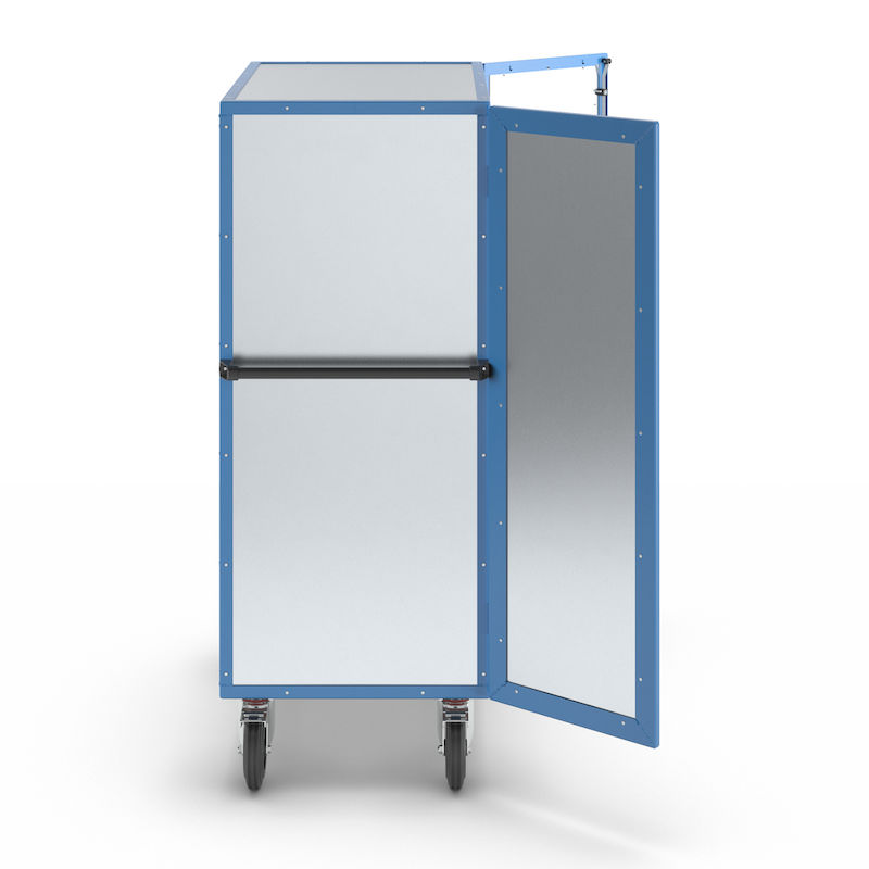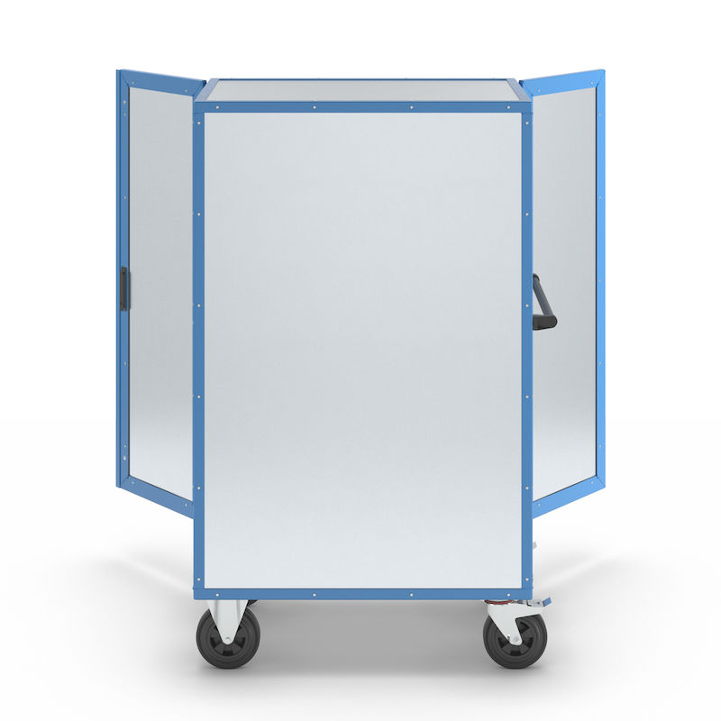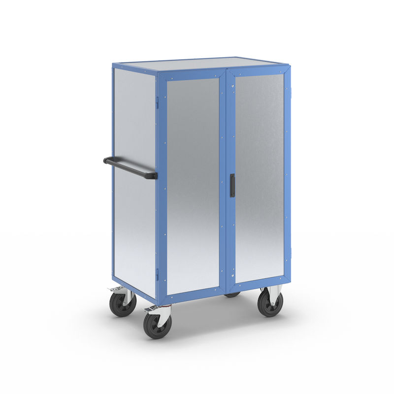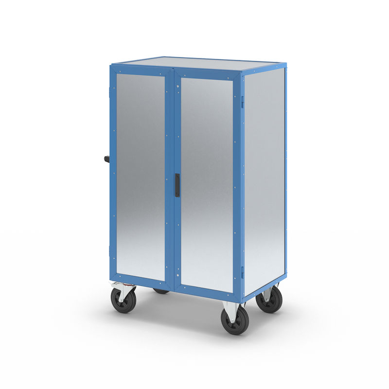 Verkstadsvagn Henrik, pardörrar av galvaniserad stålplåt, utan hyllplan. Stabil stålkonstruktion, pulverlackerad i ljusblått RAL 5012 i standardutförande. Bottenplatta av plast. Med cylinderlås med huvudnyckel.