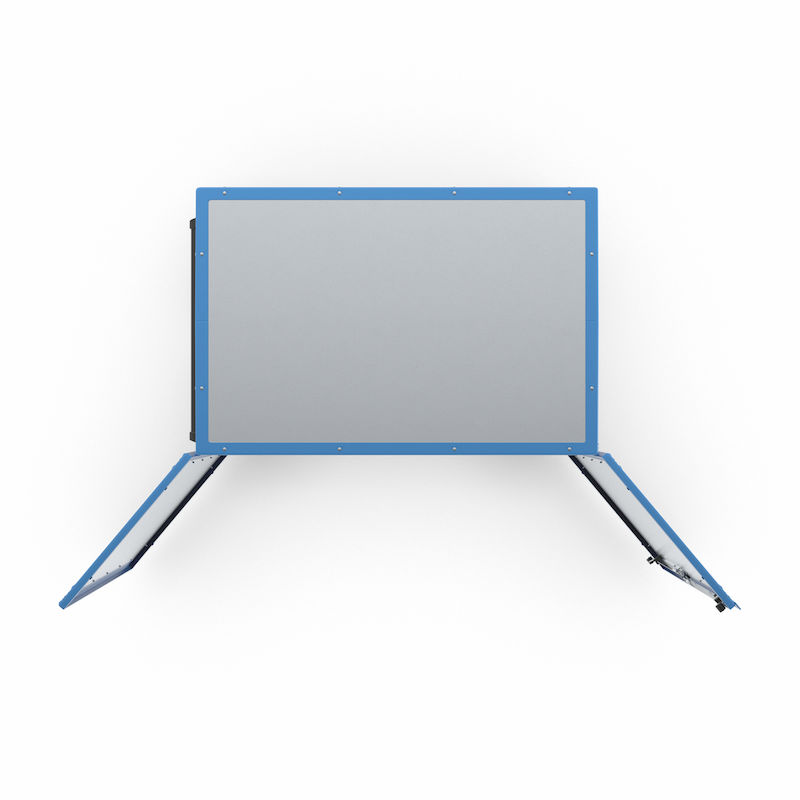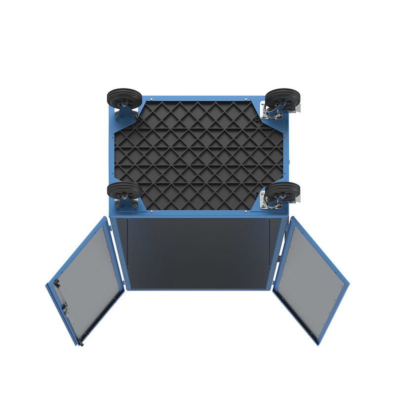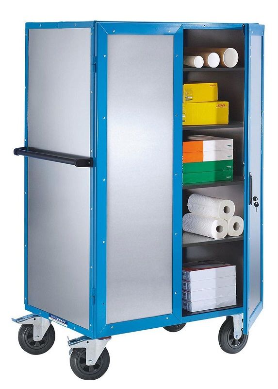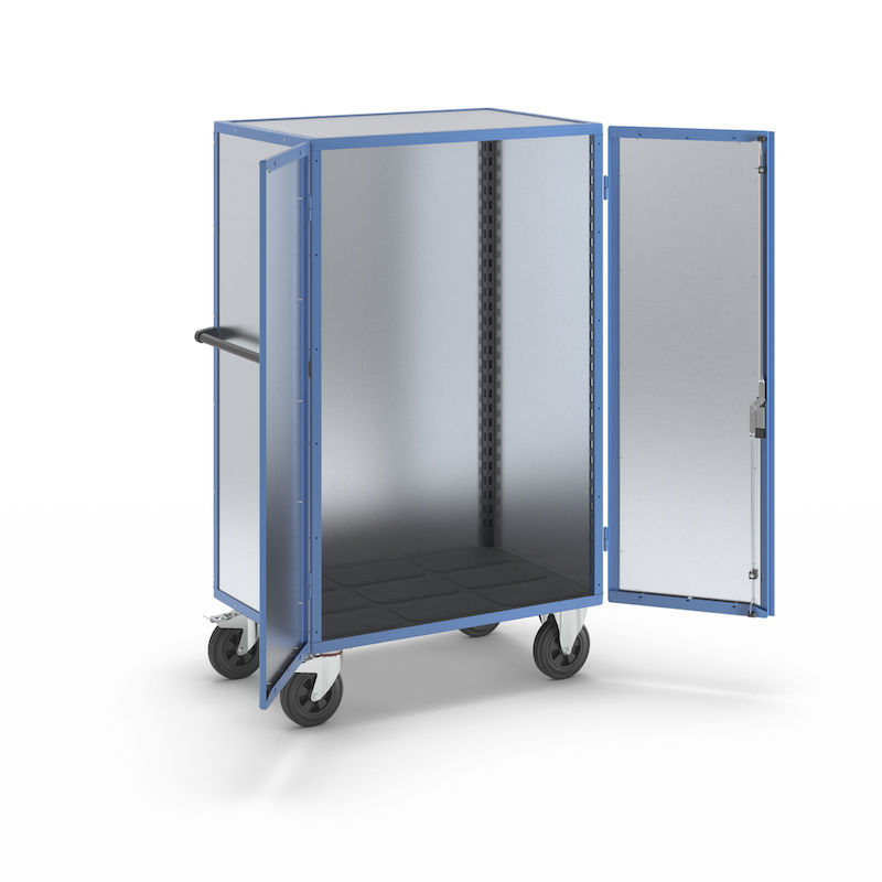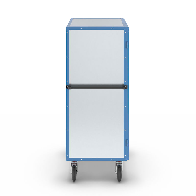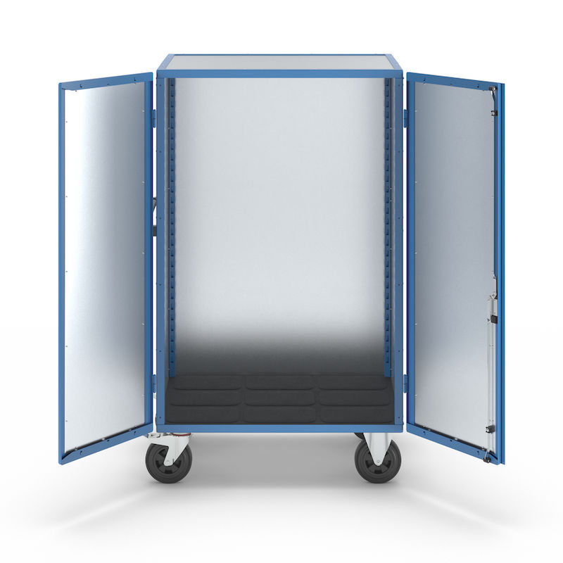 Verkstadsvagn Henrik, pardörrar av galvaniserad stålplåt, utan hyllplan. Stabil stålkonstruktion, pulverlackerad i ljusblått RAL 5012 i standardutförande. Bottenplatta av plast. Med cylinderlås med huvudnyckel.