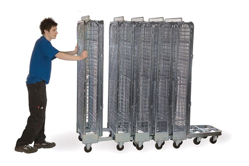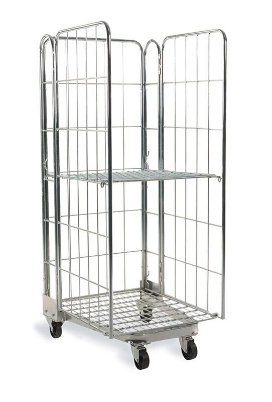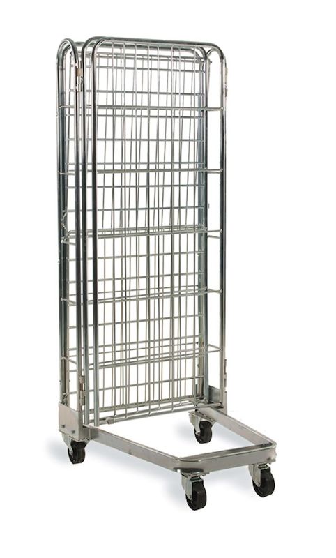 Stackningsbar Rullcontainer, 3 väggar, LxBxH 720x800x1800 mm. En rullcontainer med 3 eller 4 väggar som är stackningsbar, vilket sparar på utrymme, då bottnen går att fälla upp.