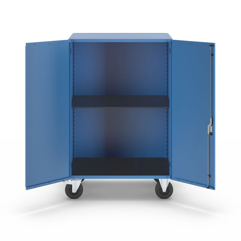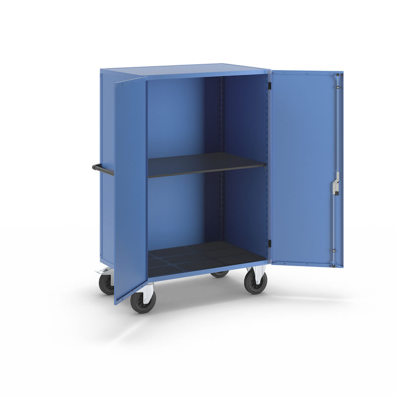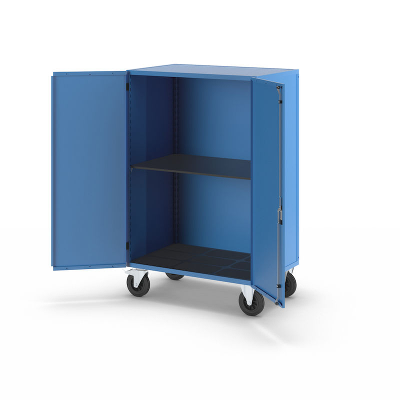 Verkstadsvagn Henrik, med parörr, låsbar, med 1 hyllplan. Verkstadsvagnen imponerar med sin säkerhet och mångsidighet. Den robusta stålkonstruktionen med högkvalitativ pulverlackering är både hållbar och stabil. De icke-transparenta dubbeldörrarna skyddar effektivt mot nyfikna blickar. Tack vare Basquille-låssystemet och cylinderlåset med huvudnyckel är innehållet väl skyddat mot obehörig åtkomst. Den halkfria bottenplattan av återvunnet plastmaterial säkerställer att innehållet står stadigt. Dess slitstarka, väderbeständiga samt olje- och syrabeständiga yta gör den idealisk för krävande arbetsmiljöer. Verkstadsvagnen är perfekt för industri, bilverkstäder eller produktionsföretag. En genomtänkt lösning för organiserad förvaring och enkel transport.