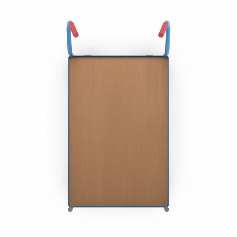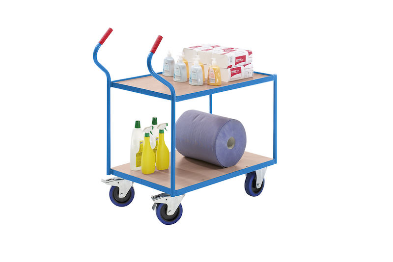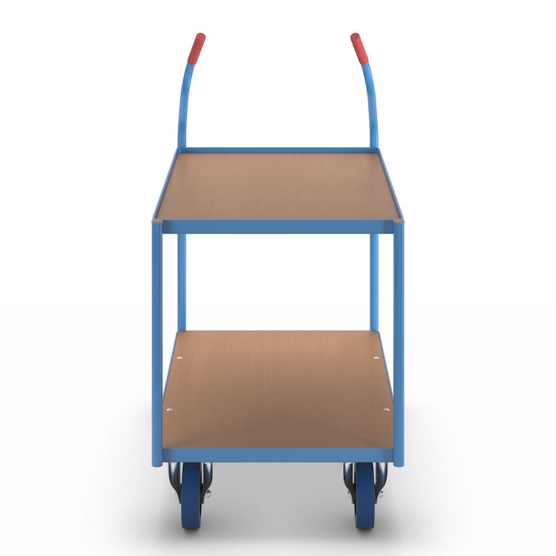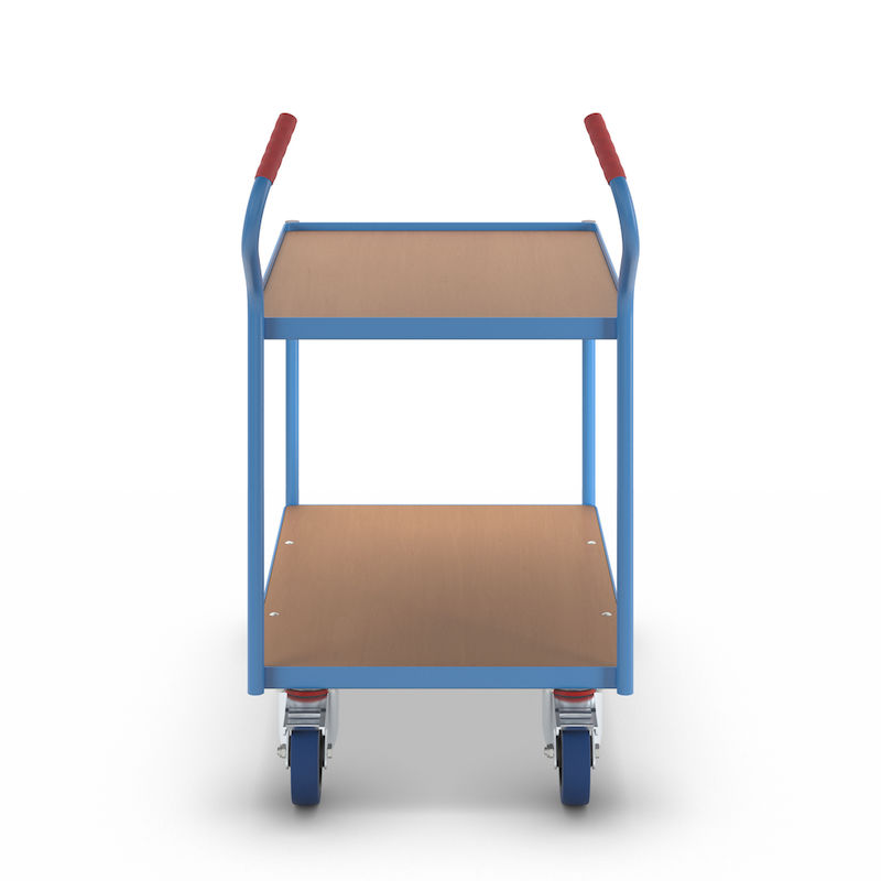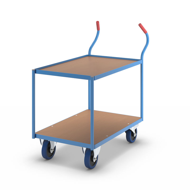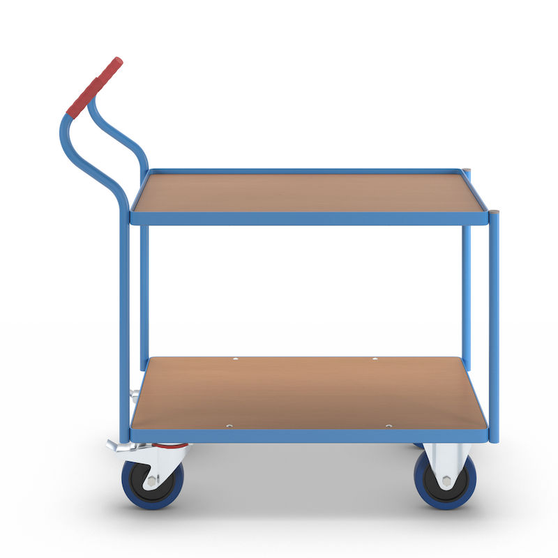 Bordsvagn Julius, gummihjul, lämnar inga märken, hyllplanshöjder 235/765 mm. Optimal kraftöverföring och smidighet. Den övre nivån har en 15 mm uppvikt stålkant som förhindrar att föremål rullar av. Lastytorna består av skivor med bokdekor.