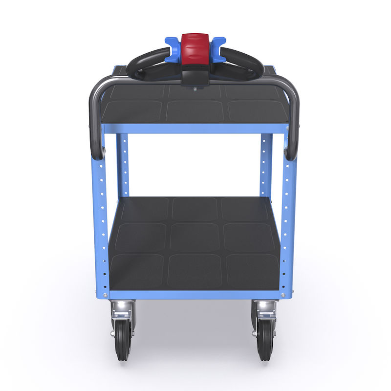 Elmodulen möjliggör enkel navigering och bekvämt handhavande med ett ergonomiskt utformat, multifunktionellt dragstångshandtag. Den är lättstyrd med stabila rörbyglar och erbjuder steglös hastighetsstyrning via två tumknappar (maxhastigheten är 4 km/h). Krypgång kan aktiveras vid behov för precisionskörning framåt och bakåt. Ytterligare säkerhetsfunktioner inkluderar en varningsfunktion i form av en tuta på handtaget och en skyddsbrytare som förhindrar fastklämning när vagnen backas. Det integrerade fotskyddet säkerställer att ingen kläms under vagnen. Elmodulen kräver inget förarbevis och har ett stöldskydd med låsfunktion för att begränsa åtkomst till batteriet.