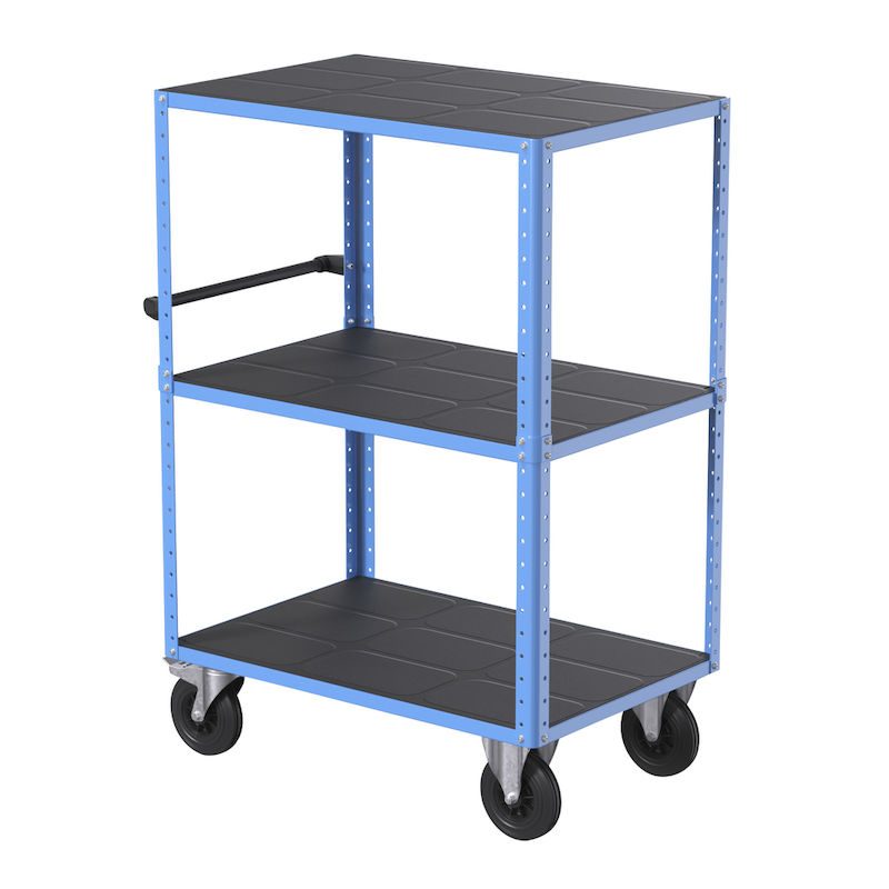 Hyllvagn CustomLine, 3 hyllplan, ljusblå RAL 5012, massivgummi. Hyllvagnen eurokraft pro är en perfekt lösning för individuella behov inom industri och produktion. Den innovativa produkten i vår mångsidiga produktserie CustomLine står för flexibilitet och modulanpassning med olika kombinationsmöjligheter och tillbehör. Hyllvagnen är en tillförlitlig partner i det dagliga arbetet. Den anpassas flexibelt efter din verksamhets behov och effektiviserar dina processer.