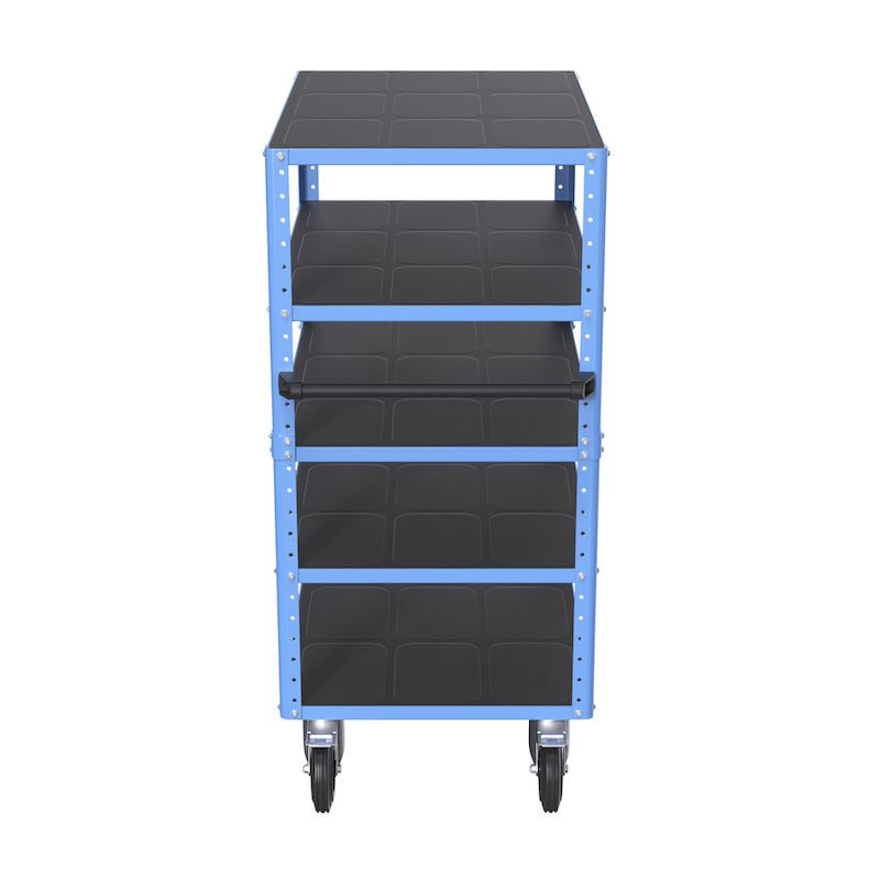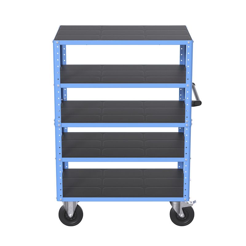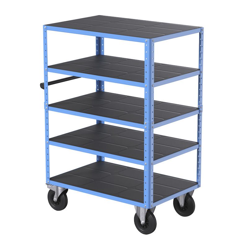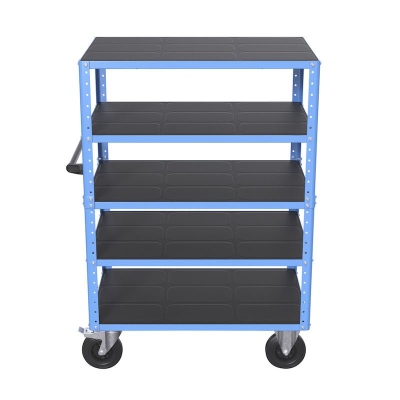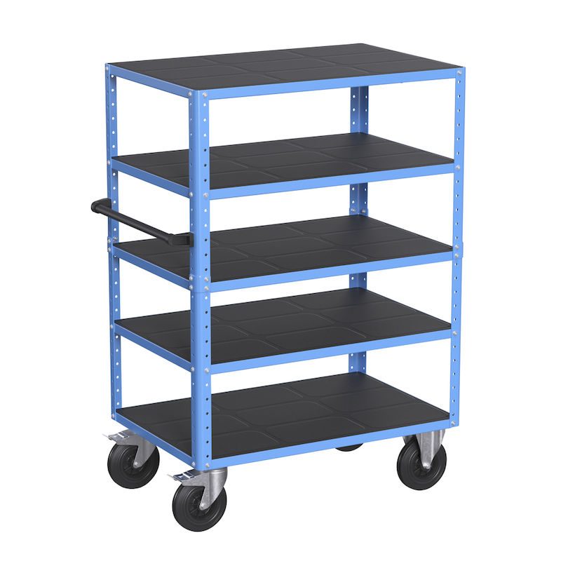 Hyllvagn CustomLine, 5 hyllplan, ljusblå RAL 5012, massivgummi. Hyllvagnen eurokraft pro är en perfekt lösning för individuella behov inom industri och produktion. Den innovativa produkten i vår mångsidiga produktserie CustomLine står för flexibilitet och modulanpassning med olika kombinationsmöjligheter och tillbehör. Hyllvagnen är en tillförlitlig partner i det dagliga arbetet. Den anpassas flexibelt efter din verksamhets behov och effektiviserar dina processer.