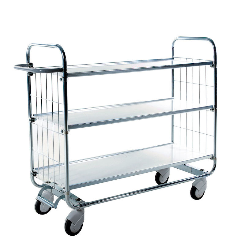 Hyllvagn Enrica, 1395x470x1120 mm, 3 hyllplan. En unik och innovativ vagn där hjulen låses med en pedal på kortsidan, tack vare denna centrallåsstyrning blir vagnen funktionell för alla områden.