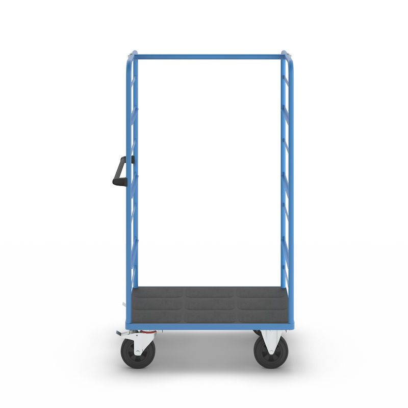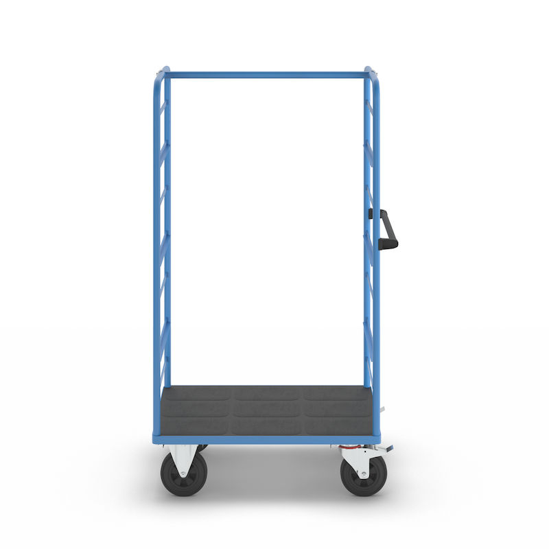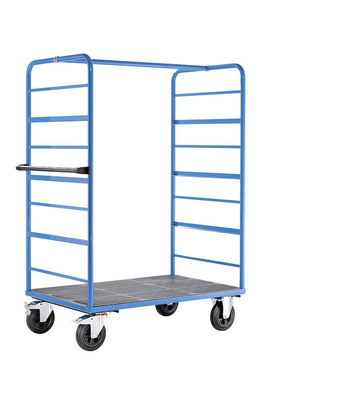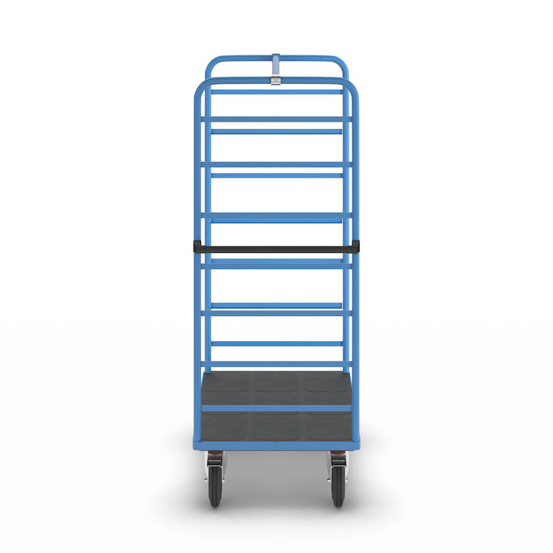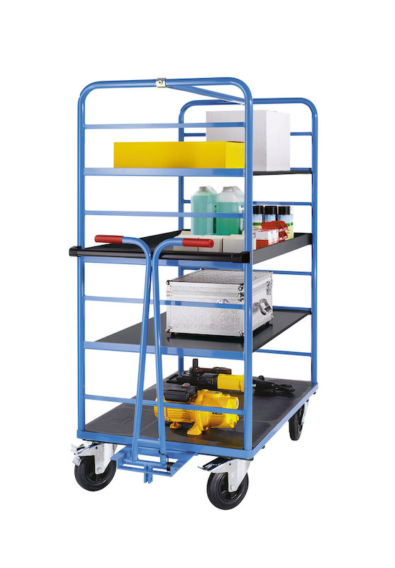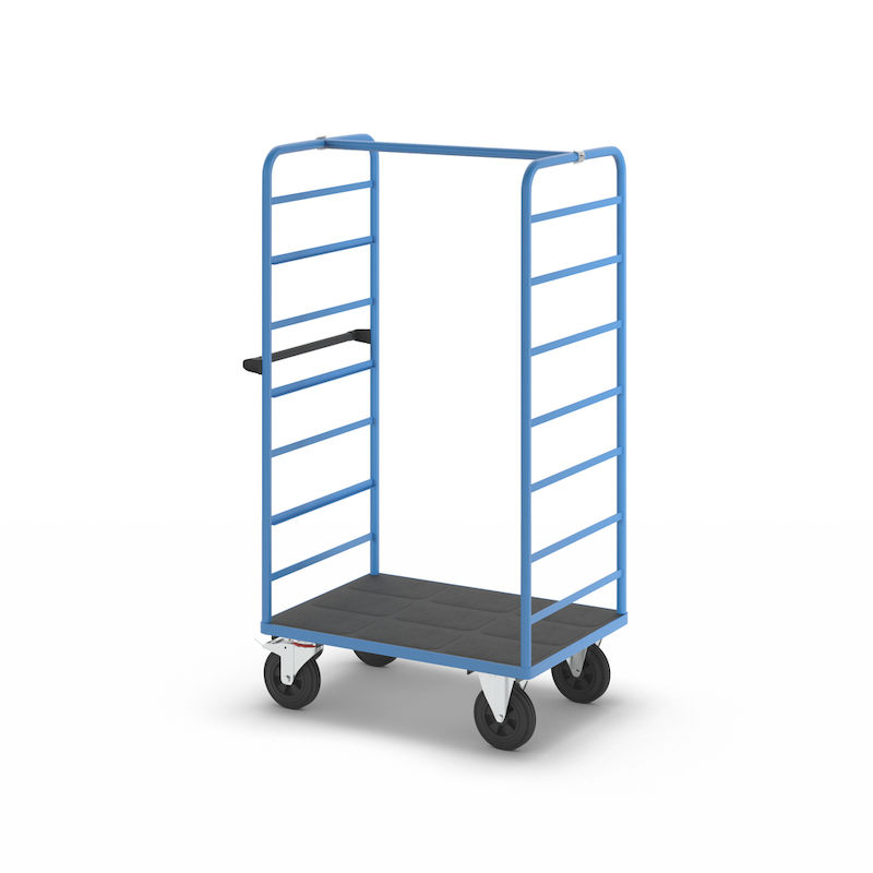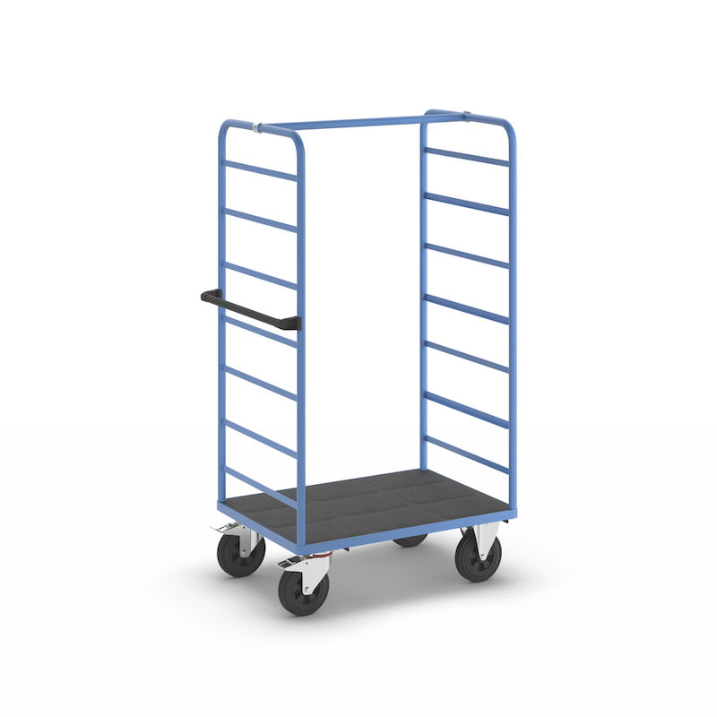 Hyllvagn Ilotar, 2 gavlar, lastyta 975 x 700 mm, massivgummi. Stabil svetskonstruktion, pulverlackerad i ljusblått RAL 5012 och flexibel att använda.