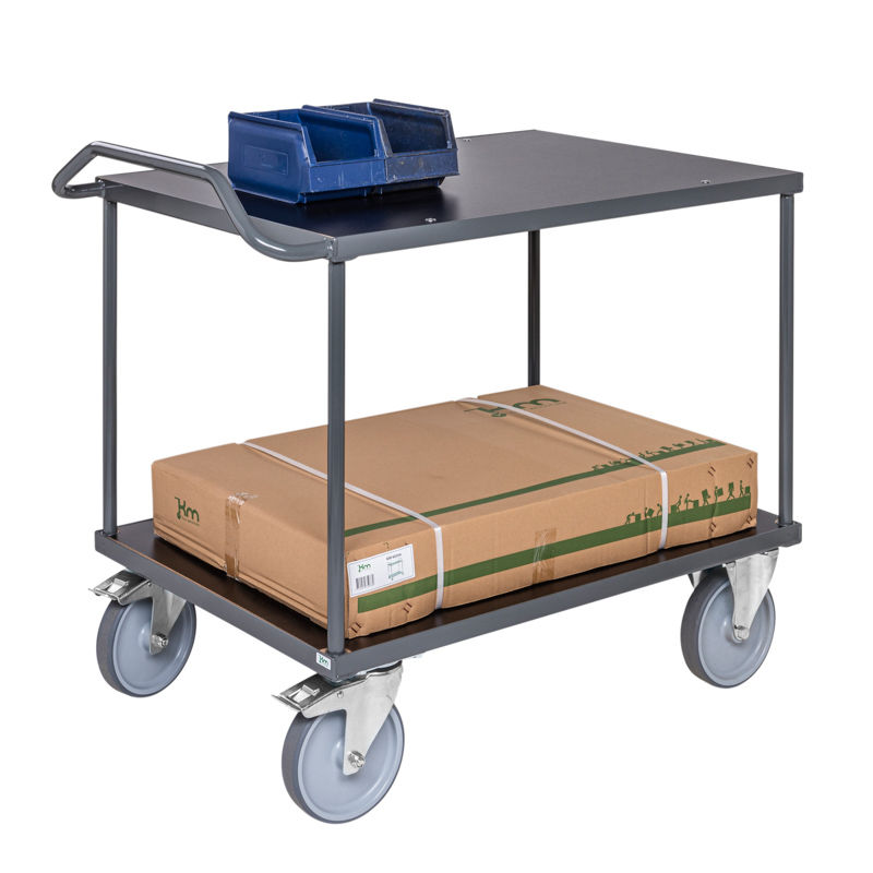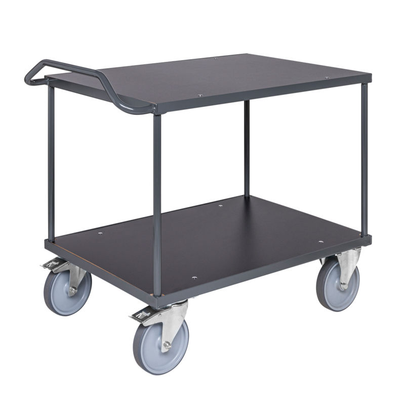 Ergonomisk och tålig bords- och verkstadsvagn med kraftig stålram pulverlackerad i grått. Skivor i laminat. Vagnen har ergonomiskt vinklade handtag för att underlätta handhavandet. Avstånd till första hyllplan 240 mm och avståndet mellan hyllplanen är 580 mm. Bordsvagnen är utrustad med lättrullade termogummihjul.