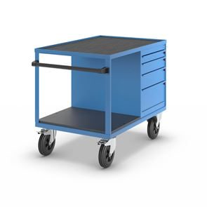 Verktygsvagn Madina, 1 skåp till vänster, arbetsyta av plast, ljusblå RAL 5012. Stabil stålkonstruktion. Pulverlackerad med hög kvalitet. Solid skjutbygel som klickas fast.