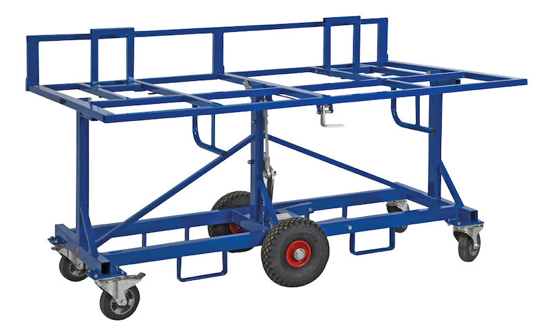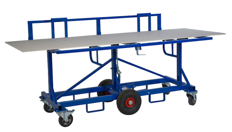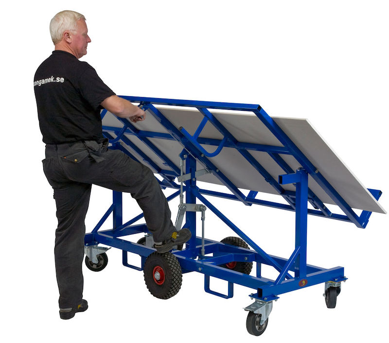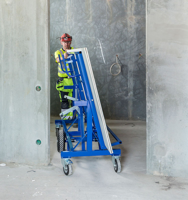 Skivvagn med lyft och tilt, LxBxH 1900x700x1470 mm, max 500 kg. Blålackerad och elförzinkad kraftig skivvagn som underlättar hantering av skivmaterial, till exempel gipsskivor.