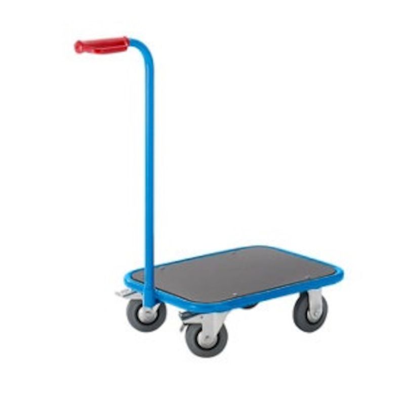 Skyffelvagn Asar, max 250 kg, LxBxH 600x450x185 mm. En skyffelvagn med en lastkapacitet på 100-250 kg beroende på modell. Stålrörsram pulverlackerad som standar i ljusblå färg (RAL 5012). Skonsamma massivgummihjul, rullager. För transport av staplingsbara plastbehållare, korgar och liknande. Lastyta av MDF, stålplåt eller vinkelstål.