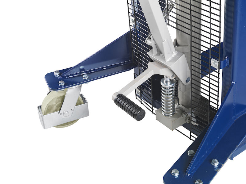 En robust konstruktion med förstärkt mastprofil och hydraulkolv i krom gör staplaren särskilt hållbar och tillförlitlig. Skyddsgallret över lastkedjorna och lyftcylindern skyddar mot fallande föremål och ger samtidigt fri sikt i körriktningen. Stora skjutbyglar ger ett bekvämt grepp och smidig manövrering. Låsbara styrhjul säkerställer stabilitet.