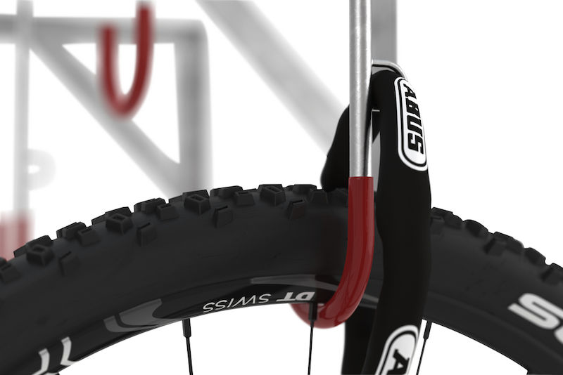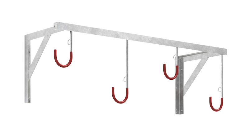 Cykelhängare Carsten, för väggmontering, längd 1170 mm. Cykelupphängningen har fyra hjulhållare, en fästskena och väggkonsoler av profilstål. Den är varmgalvaniserad. Hängaren består av rundstål med plastöverdrag som skyddar fälgarna. Kroklängd min/max: 200/350 mm.