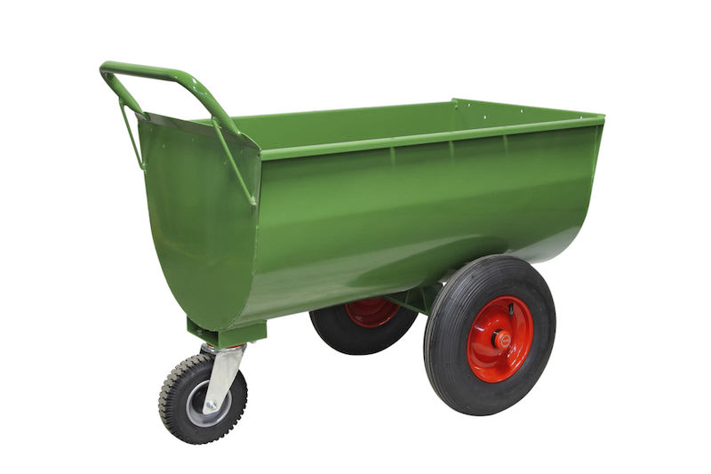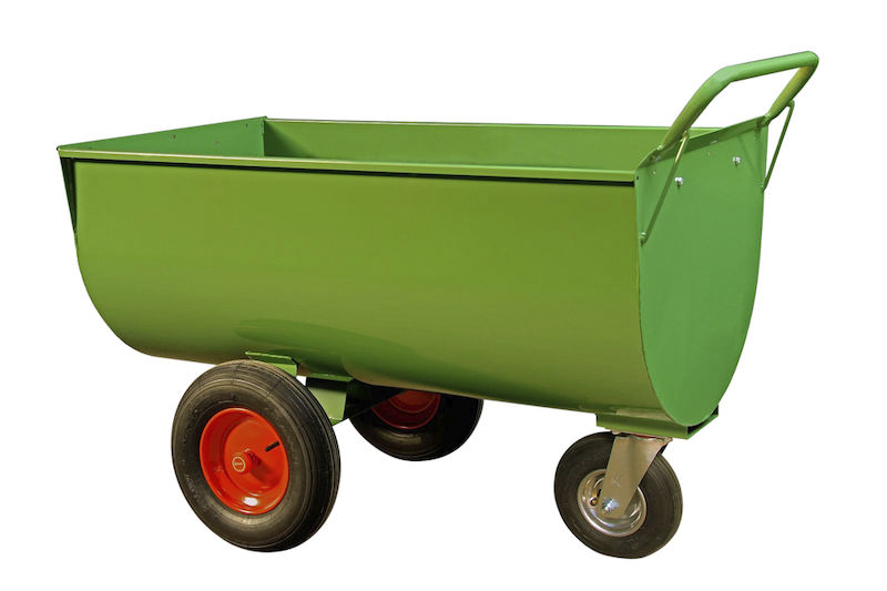 Den gröna pulverlackeringen (RAL 6010) ger långvarigt rostskydd. Den medföljande mineralbehållaren kompletterar vagnen både funktionellt och effektivt.