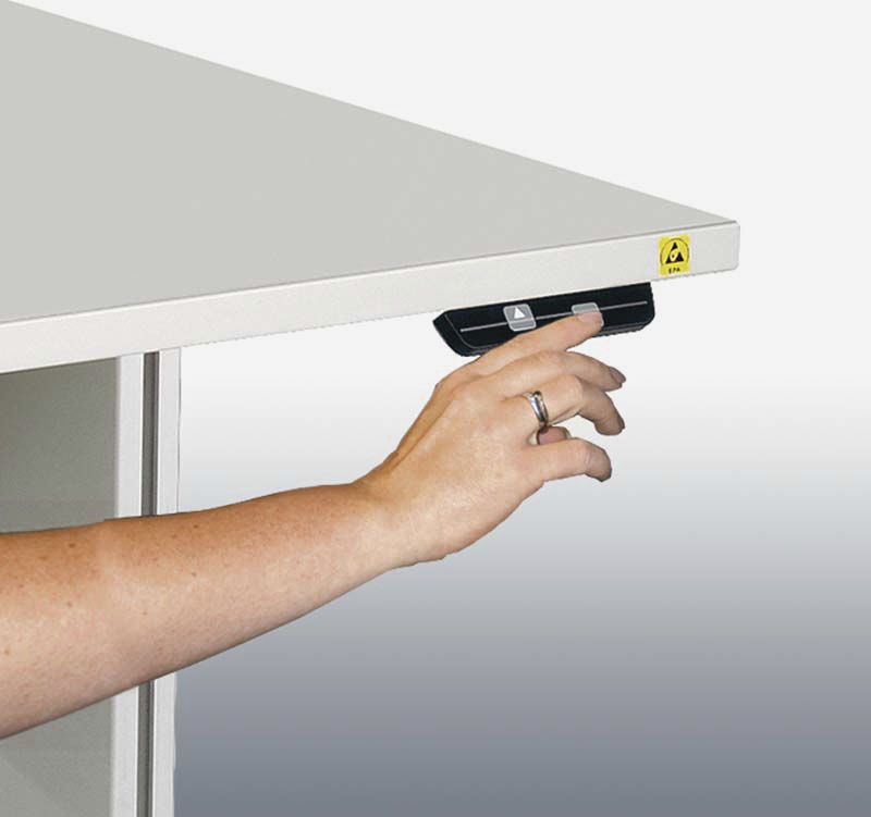 Arbetsbänk Eivind, med elmotor, BxD 1073 x 800 mm. Stabilt stålstativ, pulverlackerad i ljusgrå RAL 7035. Arbetsskiva, 25 mm tjock. Båda sidor har ett ytskikt i melamin i bländfri bruten vit (DIN 68765).
