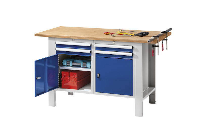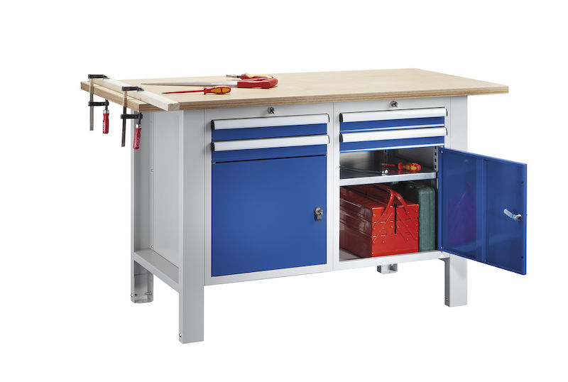 Arbetsbänk Henning, skivans tjocklek 1500 mm, 4 lådor, 2 dörrar, multiplexskiva. Stabil, pulverlackerad stålkonstruktion. Ljusgrått underrede RAL 7035.