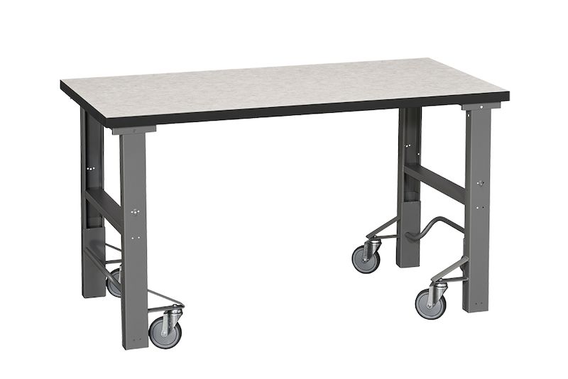 Arbetsbänk med hjul Tor, med mobilt och höj- och sänkbart underrede, 1600 x 800 mm, vinyl. Arbetsbänk på hjul med en massiv arbetsyta som klarar en belastning på upp till 300 kg. Bänken är utrustad med ett fällbart underrede med fyra länkhjul. Tryck ned hjulen med fotpedalen för att enkelt flytta bänken och fäll in dem igen för att få en stadig och stabil arbetsstation. Bordshöjden kan anpassas manuellt från 850 till 1100 mm (exkl. bordsskiva). Den slitstarka laminatskivan har en tålig och lättstädad yta.