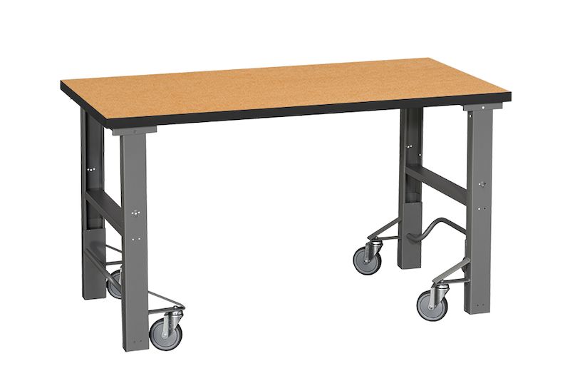 Arbetsbänk med hjul Tor, med mobilt och höj- och sänkbart underrede, 2000 x 800 mm, träfiberskiva. Arbetsbänk på hjul med en massiv arbetsyta som klarar en belastning på upp till 300 kg. Bänken är utrustad med ett fällbart underrede med fyra länkhjul. Tryck ned hjulen med fotpedalen för att enkelt flytta bänken och fäll in dem igen för att få en stadig och stabil arbetsstation. Bordshöjden kan anpassas manuellt från 850 till 1100 mm (exkl. bordsskiva). Den slitstarka laminatskivan har en tålig och lättstädad yta.