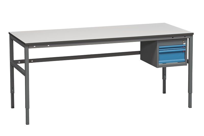 Arbetsbord Embla med 2-lådig hurts, 1600x600 mm, grå laminat. Komplett arbetsbord med 2-lådig förvaringshurts, 325x385x500 mm. Mycket stabil konstruktion med kraftiga profilrör, 40x40 mm, i grå pulverlack. Bordet är komplett med 3 tvärstag som förbinder H-stativen, vilket ökar stabiliteten ännu mer. Bordsskivorna är 24 mm tjocka, i ljusgrå högtryckslaminat eller limmad grå vinyl. Grafitgrå kantlister till alla bordsskivor.